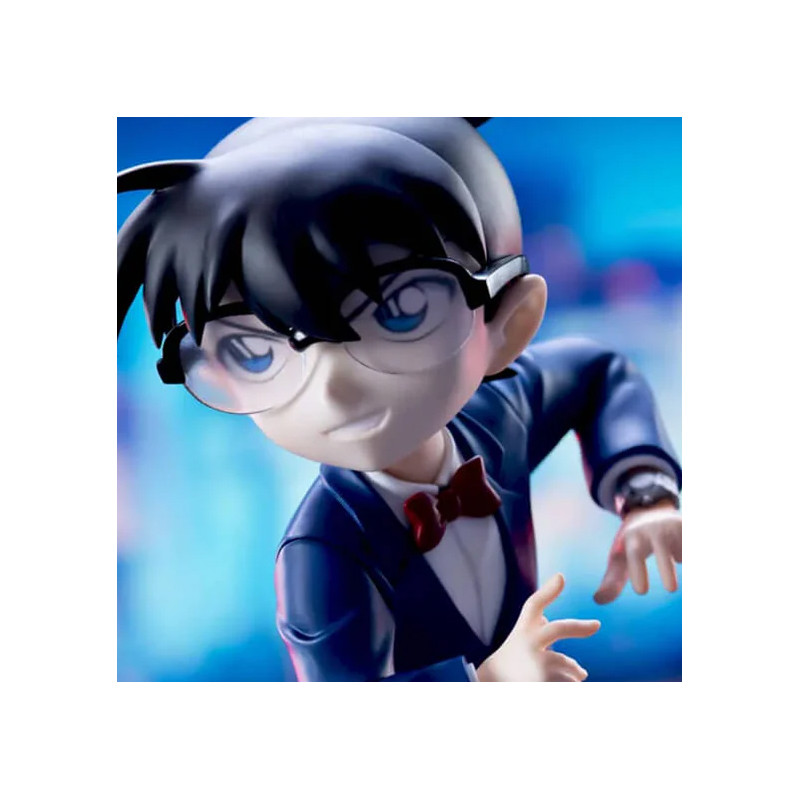 Derrière son apparence enfantine se cache l’esprit brillant de Shinichi Kudo, et cette représentation de Edogawa Conan le prouve avec éclat. Son regard déterminé derrière ses lunettes rondes, son sourire confiant et son attitude prête à l’action traduisent toute la complexité du héros : un mélange de malice, d’intelligence et de courage. Vêtu de son indémodable costume bleu et de son nœud papillon rouge, il semble prêt à activer sa montre anesthésiante à tout moment. Le socle, représentant un sol fissuré, ajoute une dimension dramatique à la scène, évoquant les multiples dangers et mystères qu’il affronte. Les reflets urbains qui se dessinent sur sa silhouette renforcent l’atmosphère d’enquête nocturne typique de Detective Conan, capturant à merveille l’esprit de la série.