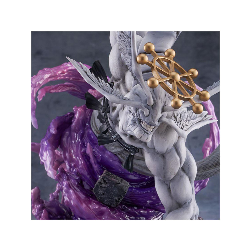 Le Sila Mahoraga de la gamme FiGURiZM impose immédiatement le respect. Sa posture menaçante, accroupie, prêt à frapper de son sabre, dégage une intensité palpable. Son corps sculpté avec précision, aux muscles tendus et aux marques profondes, témoigne d’une maîtrise exceptionnelle des volumes et des contrastes. Son halo doré et sa spirale d’énergie violette translucide, tourbillonnant autour de lui, illustrent à la perfection la fureur du rituel d’exorcisme. Les effets dynamiques et la texture pierreuse du socle amplifient l’impression de mouvement et de puissance. SEGA livre ici une pièce de collection d’une intensité rare, où chaque ombre, chaque pli et chaque éclat de matière semble animé d’une énergie surnaturelle.