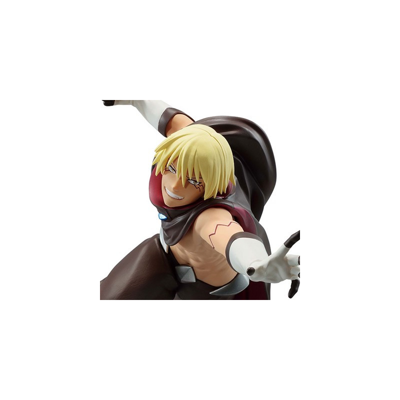 Mais cette fois-ci, le Dragon a troqué sa force animale et majestueuse pour devenir un jeune homme aux cheveux blonds. Il a troqué ses ailes contre une grande cape noire et dont l'intérieur est rouge. Le blondinet adopte une posture dynamique, comme s'il s'élançait vers quelque chose pour l'attraper. Serait-il à la poursuite de Slime pour lui chahuter avec lui comme deux amis le feraient ? En tout cas, le mouvement de cette figurine est très appréciable et elle trouvera facilement sa place dans votre collection Moi Quand Je Me Réincarne En Slime.