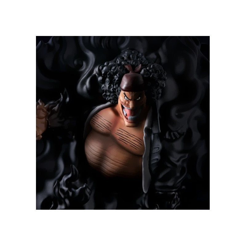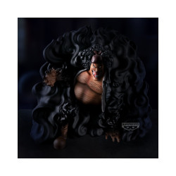 La face tordue par le rire, les cicatrices visibles sur son torse et les mèches de cheveux bouclées sont minutieusement reproduites. La masse tourbillonnante de ténèbres qui l’enveloppe donne une impression de mouvement constant, comme si son pouvoir dévorait la lumière elle-même. Une réalisation soignée par Banpresto, qui offre une représentation saisissante du redouté pirate de One Piece.