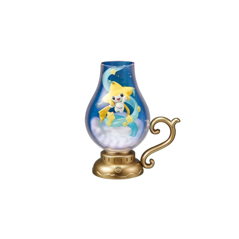Endormi la majeure partie du temps, Jirachi est connu pour exaucer les souhaits de ceux qui parviennent à le réveiller. Dans ce diorama lumineux, il tournoie gracieusement au milieu d’un tourbillon de rubans bleutés et d’étoiles dorées, flottant au-dessus d’un doux nuage qui évoque la pureté et la sérénité. Son regard plein de bienveillance et son léger sourire traduisent toute la douceur de ce Pokémon légendaire, à la fois mystérieux et apaisant. Le design de la lanterne, inspiré des lampes anciennes, magnifie son caractère éthéré : la transparence du verre laisse apparaître la danse des étoiles, créant un jeu de lumière enchanteur qui semble venir d’un autre monde. On y retrouve toute la délicatesse et la symbolique du vœu cher à l’univers de Pokémon, où Jirachi incarne l’espoir et la magie des cieux.