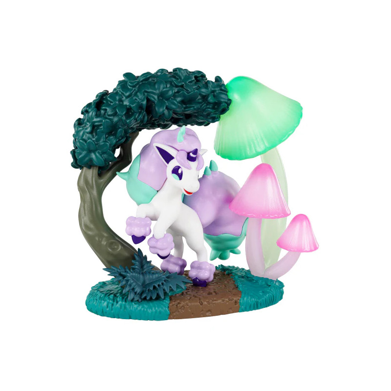 Émergeant d’un sous-bois mystérieux, Ponyta de Galar dévoile toute sa grâce et son éclat dans cette splendide création signée Re-Ment. Ce fabricant japonais, reconnu pour ses miniatures d’exception et ses décors poétiques, met une fois de plus en lumière la beauté et la fantaisie de l’univers Pokémon. Issue de la Circular Diorama Collection, cette pièce transporte le regard dans une forêt enchantée où les arbres aux feuilles d’émeraude côtoient de gigantesques champignons luminescents. L’atmosphère y est douce et surnaturelle, baignée d’une lueur pastel qui évoque les contes et les rêves. On y découvre Ponyta de Galar dans toute sa splendeur, au détour d’un sentier magique où chaque détail semble vibrer de vie et de mystère.