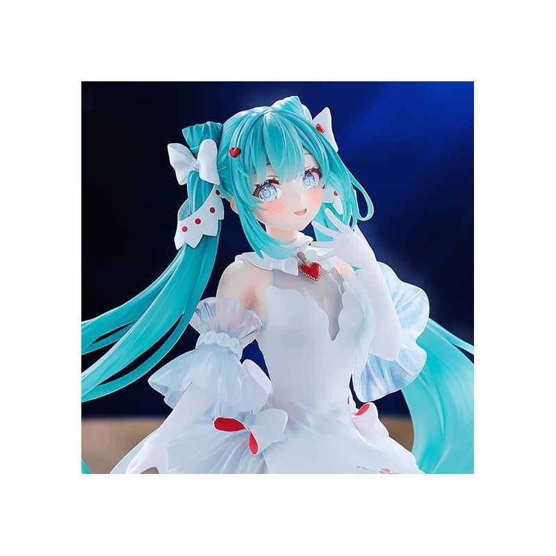Toujours empreinte de douceur et d’élégance, Hatsune Miku dévoile ici une allure féérique. Son regard pétillant, son sourire délicat et sa posture gracieuse traduisent toute la sensibilité de cette icône virtuelle, devenue une véritable muse pour des millions de fans à travers le monde. Sa longue chevelure turquoise, réalisée en dégradés translucides, semble flotter autour d’elle tel un courant marin. La robe blanche, subtilement nacrée, est ornée de rubans rouges et de touches dorées, tandis que le socle, sculpté dans une résine claire rappelant une vague d’eau cristalline, vient sublimer l’ensemble. L’équilibre entre la pureté des couleurs et la fluidité du mouvement donne vie à une Vocaloid à la fois douce et rayonnante, symbole d’harmonie et d’émotion.